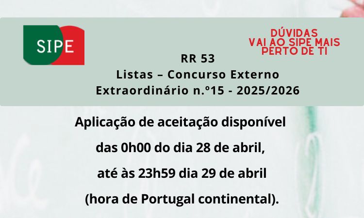Aplicação da aceitação disponível das 0:00 horas do dia 23 de abril, até às 23:59 horas do dia 24 de abril de 2026 (hora de Portugal continental). Publicitação das listas definitivas de Colocação, Não Colocação, Retirados e Listas de Colocação Administrativa – 52.ª Reserva de Recrutamento 2025/2026 e as listas definitivas de colocação e não colocação da 43.ª Reserva de Recrutamento do Concurso Externo Extraordinário 2025/2026. Consulta as Listas Listas – Reserva de Recrutamento nº 52 e Concurso Externo Extraordinário nº 14 Já sabes, qualquer questão vai ao SIPE mais perto de TI.mais informação